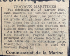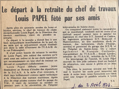 A la fin de la guerre on lui proposera de passer cadre (ingénieur-maison) s’il reste exercer deux ans de plus en Afrique. Jeune marié, après avoir hésité il décline l’offre et restera donc Agent-Technique. En 1954 il est nommé Chef de Travaux, et le restera jusqu’à sa retraite en Avril 1974.