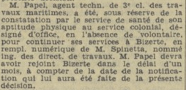 En Mai 1939 il est promu agent technique de 3ième classe. Il est par la même occasion muté d’office à Bizerte. C’est le début de la guerre.